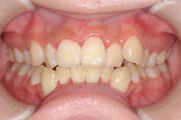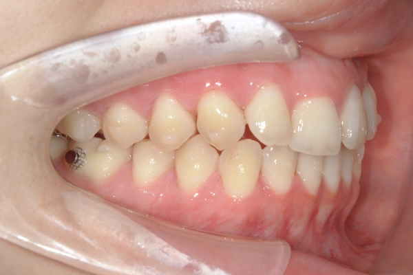 叢生(ガタガタ)の程度は軽度でしたが、前歯〜犬歯にかけては、奥歯で噛んでいるのに当たらない状態でした。また犬歯~奥歯の咬み合わせがずれており、下顎の歯列より上顎の歯列が前方に位置していました。治療では、上顎歯列を後方に移動することで犬歯〜奥歯の噛み合わせのずれを治しつつ、上下の前歯〜犬歯がしっかりと咬合するように並べました。