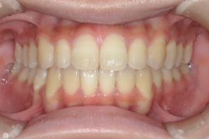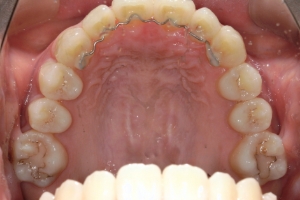 下の前歯が上あごの歯ぐきに当たるほど噛み合わせが深く、そのことが原因で上顎歯列の正中にすき間(正中離開)が生じていました。部分矯正ですき間を無理やり閉じても、噛み合わせが深いままでは治療後の再発リスクが高くなります。そのため全体矯正で奥歯の噛み合わせを整え、噛み合わせを浅くしつつ前歯を並べました。正中離開は戻りやすい傾向があるので、再発を防ぐため固定式リテーナーを推奨しています。