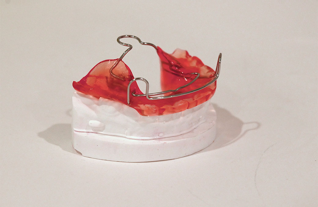 上顎前突(出っ歯)の改善に用いられる装置です。下あごの発育が遅れている場合に効果があります。 ご自身で取り外しが可能で、ご自宅にいる間(主に寝ているとき)使用していただきます。下あごの成長を促すと同時に、組み込まれているワイヤーを用いて歯列を拡大することもできます。
