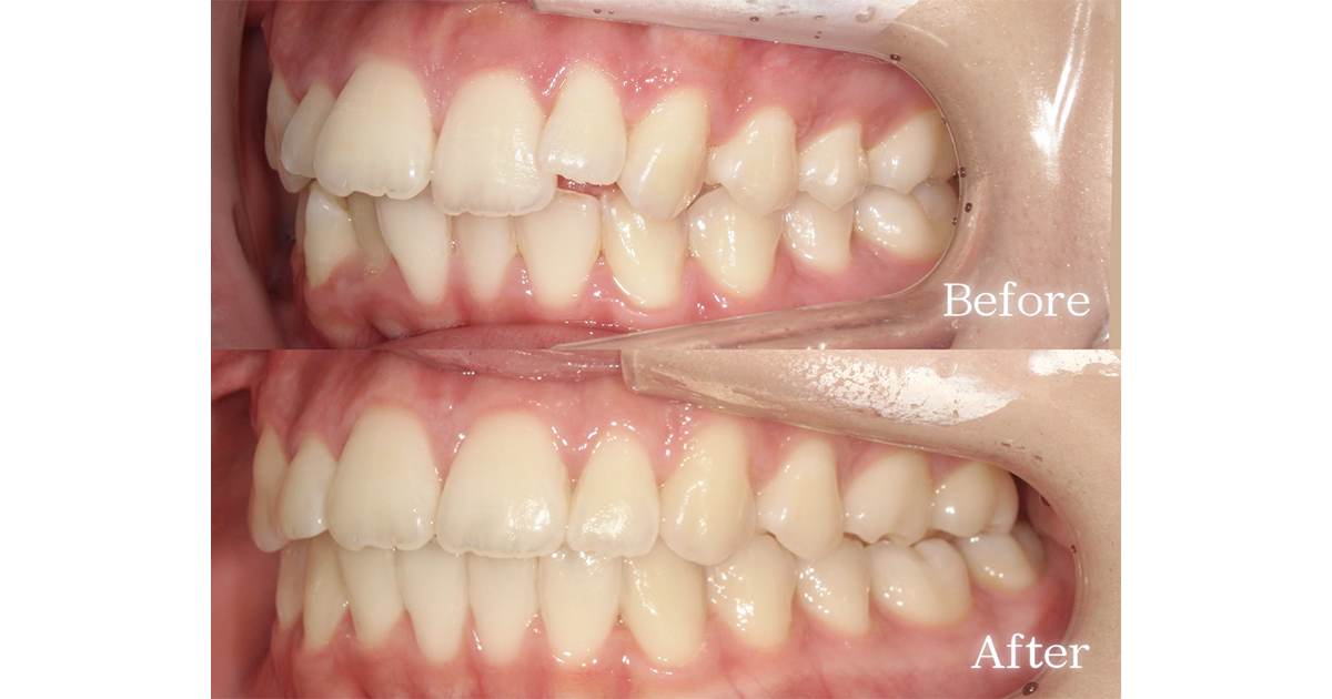 前歯がしっかり噛めていない(上顎前突)を表側ワイヤー矯正で治療した症例
